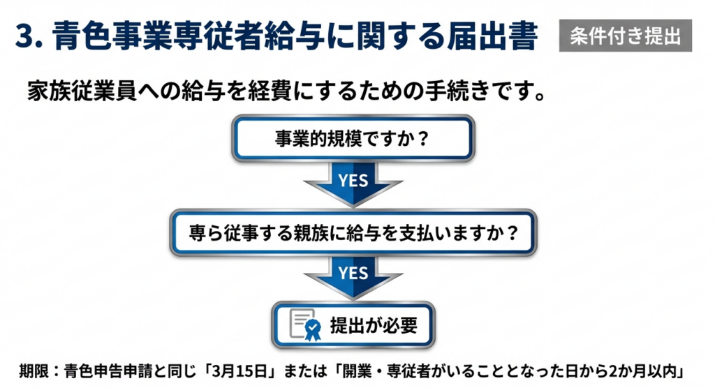 | 青色事業専従者給与に関する届出書 | ・原則:3月15日まで ・開業・新規雇用:その日から2か月以内 | 要件: 原則として「事業的規模」が前提。不提出の場合、家族への給与を必要経費に算入できません。 |