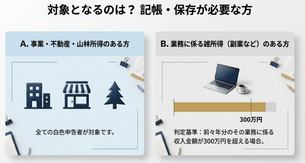 不動産所得、事業所得、または山林所得のいずれかを有する方が対象となります。これらの所得がある場合は、所得金額の多寡にかかわらず記帳を行う必要があります。