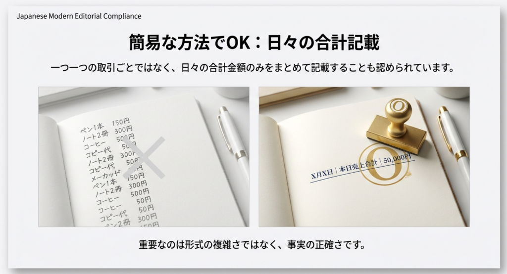 実務的な負担を考慮し、一つ一つの取引ではなく、日々の合計金額のみをまとめて記載する方法も認められています。