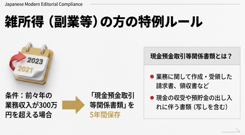 | 現金預金取引等関係書類 | 5年 | 業務に係る雑所得者(前々年収入300万円超) |