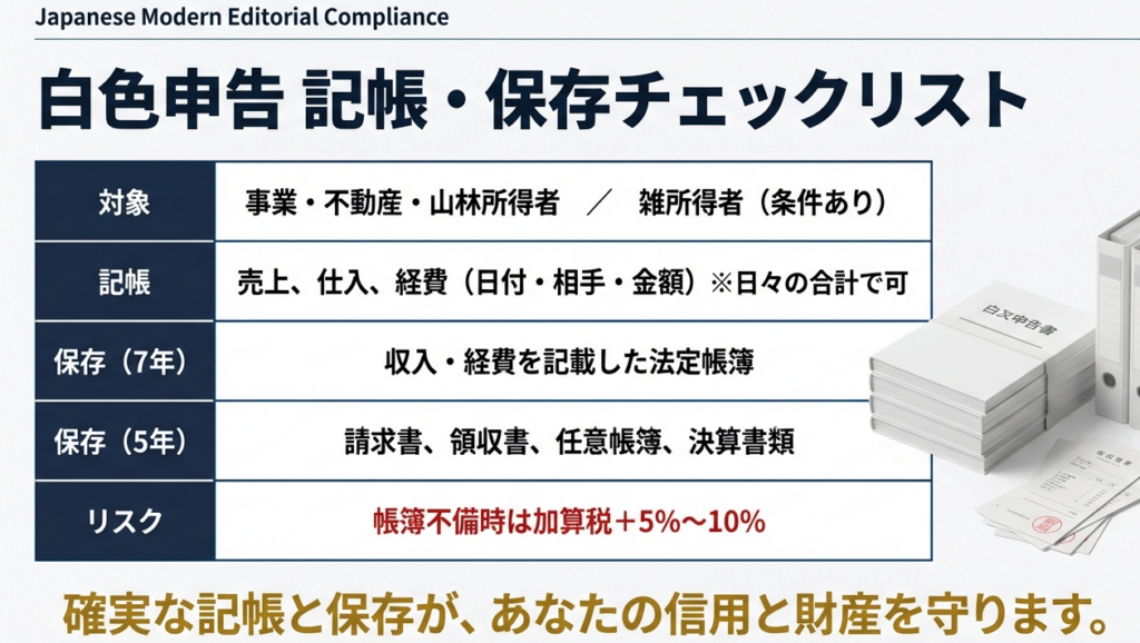 実務において、白色申告者が対応すべき事項は「記帳」と「保存」の二本柱に集約されます。スタッフの皆さんは、まずこの全体像をしっかりと自分のものにしてください。