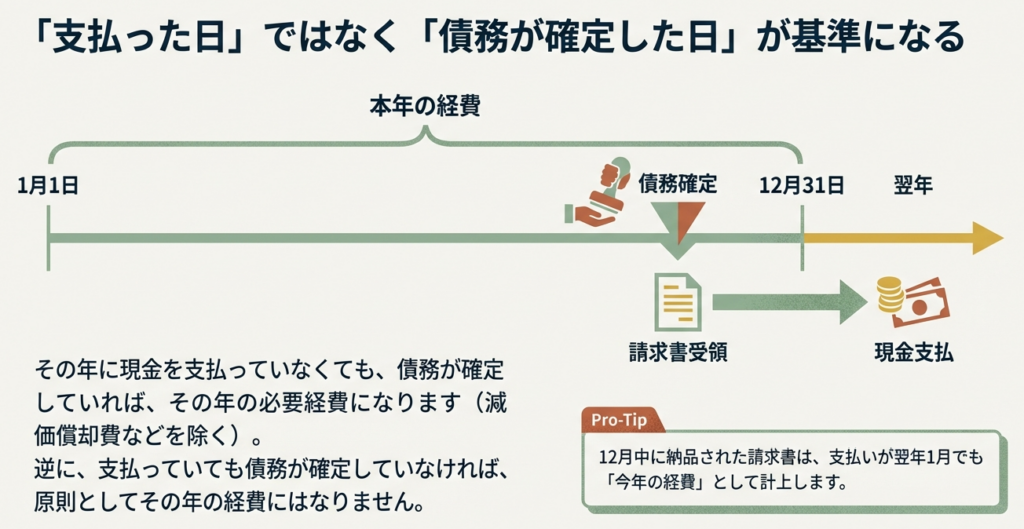 経費に計上する時期は、原則として現金を支払った日ではなく、「債務が確定した年」となります。つまり、年末時点で代金が未払いであっても、債務が成立しており、支払いの原因となる事実が発生していれば、その年の経費として認められます。