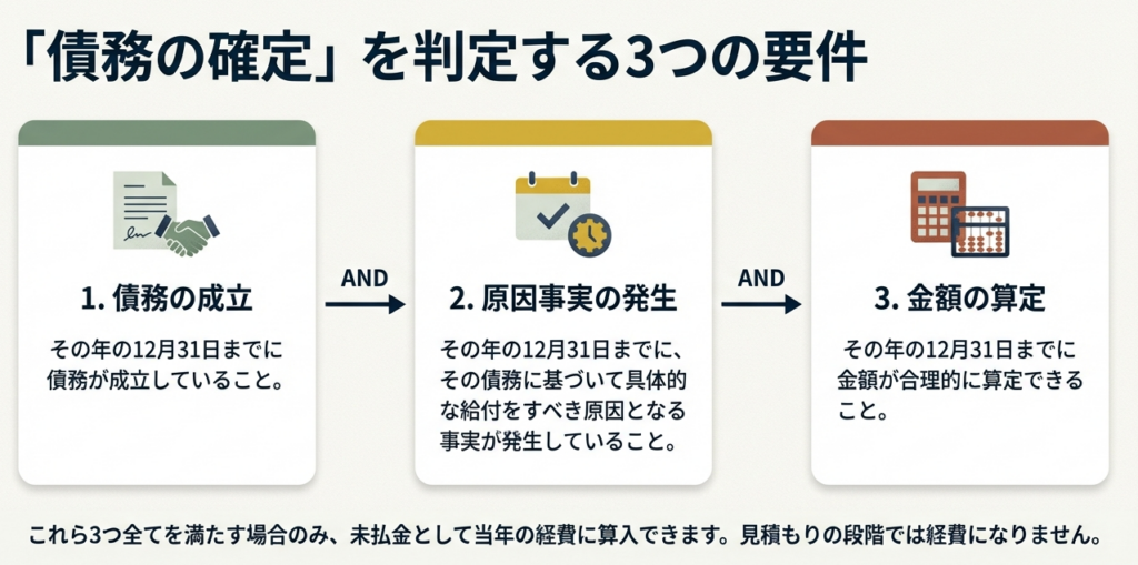 実務で「年またぎの費用」を扱う際、以下の3つの要件をすべて満たしているかを厳格にチェックしてください。一つでも欠ければ、当期の経費にはなりません。