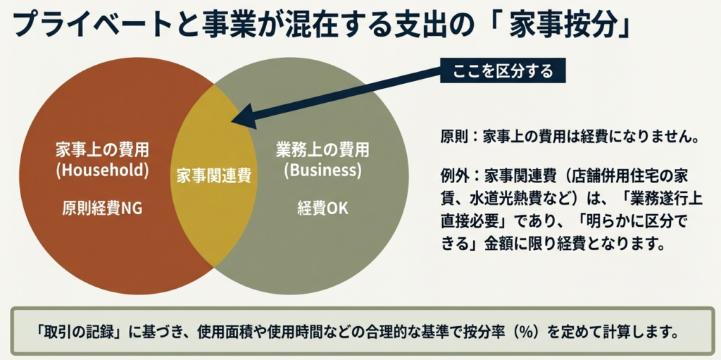 家事関連費は原則として経費になりませんが、取引記録等に基づき業務遂行上直接必要であったことが明らかに区分できる場合に限り、その区分できる金額を算入できます。例えば、店舗併用住宅の家賃や光熱費のうち、業務使用分がこれに該当します。