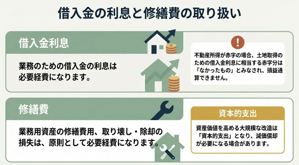 業務のための借入金であれば原則経費です。ただし、不動産所得が赤字の場合、土地取得のための借入金利子相当額は「生じなかったもの」とみなされます。 他の所得との損益通算が制限されるため、入力時には細心の注意が必要です。