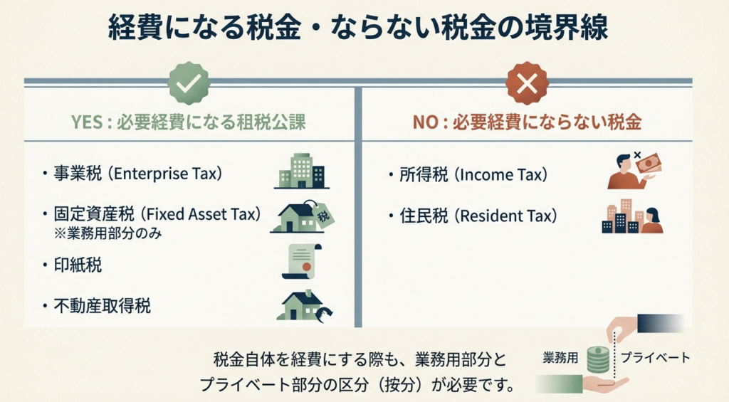所得税と住民税は必要経費として認められません。なお、事業税は全額、固定資産税は業務用の部分に限って必要経費に算入することが可能です。