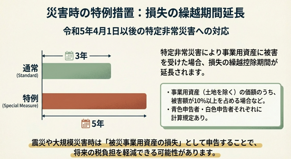 令和5年4月1日以後の特定非常災害による損失については、純損失の繰越控除期間が通常の3年から5年に延長されます。この特例は、青色申告者だけでなく、一定の要件を満たす白色申告者等にも適用されます。