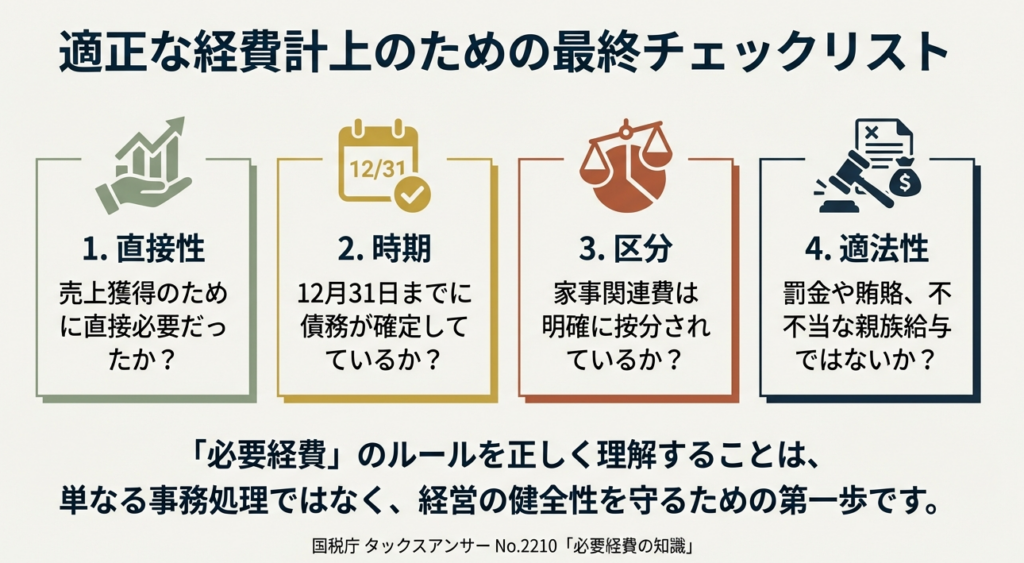 一方で、正当な経費を漏らすことは、納税者の権利である節税の機会を奪うことになります。この絶妙なバランスを保つためには、表面的な知識ではなく、法の趣旨にまで踏み込んだ深い理解が求められます。