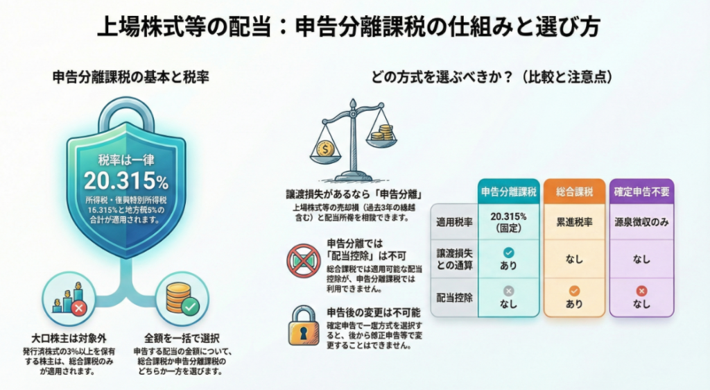 納税者は、上場株式等の配当等について、総合課税に代えて申告分離課税を選択することができます。また、確定申告不要制度を利用して申告しないことも可能ですが、申告する場合は、その年分の上場株式等の配当等の全額について、いずれかの方式を統一して選択する必要があります。