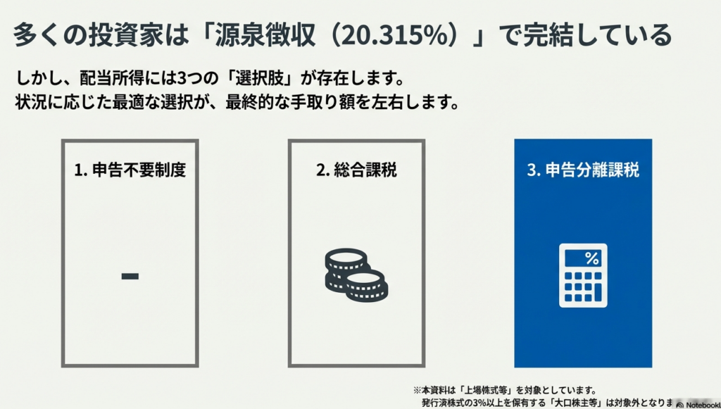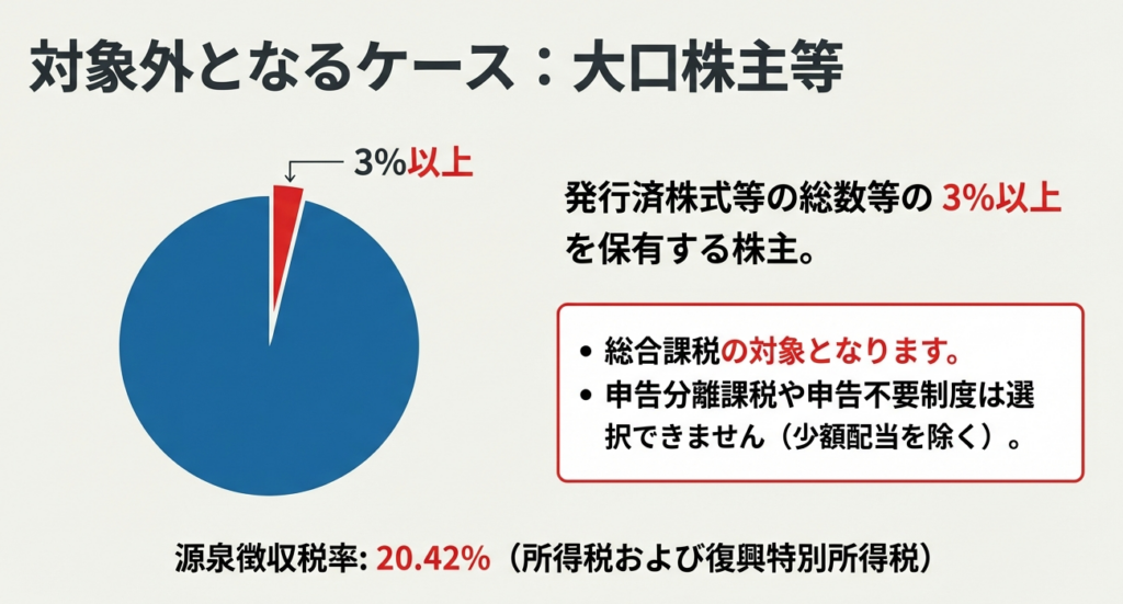 すべての上場株式配当がこの制度を使えるわけではありません。「大口株主等」が支払を受ける配当については強制的に総合課税となり、申告分離課税や申告不要を選択することはできません。