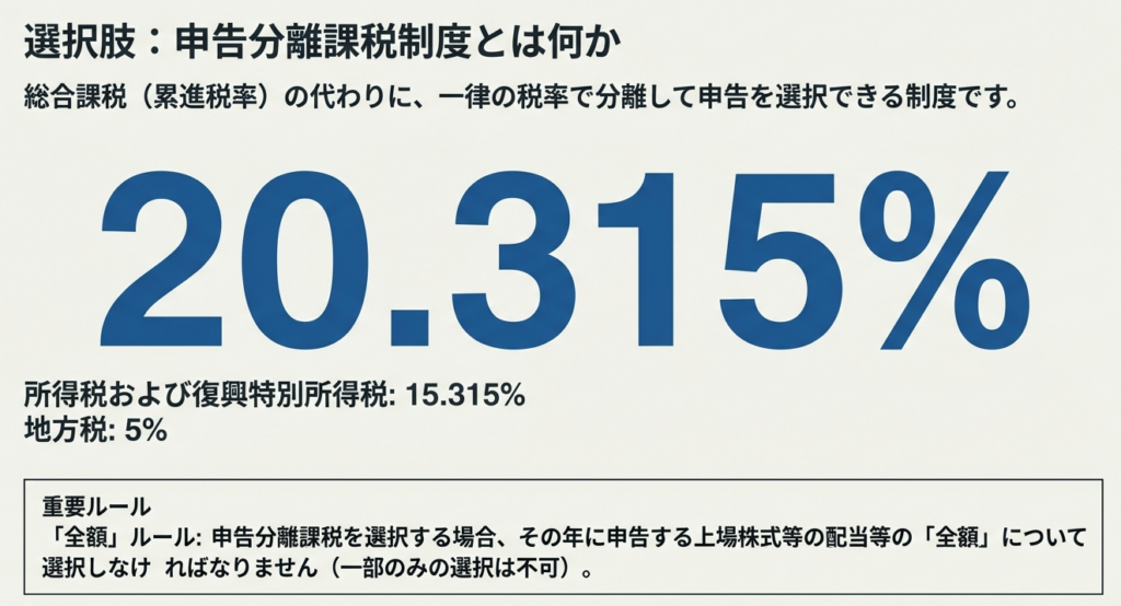 上場株式等の配当等について、総合課税に代えて選択できる制度です。税率は20.315%(所得税・復興特別所得税15.315%、地方税5%)となります。申告する場合は、その配当等の全額について選択する必要があり、銘柄ごとの選択はできません。なお、大口株主等はこの制度を選択できず、総合課税となります。