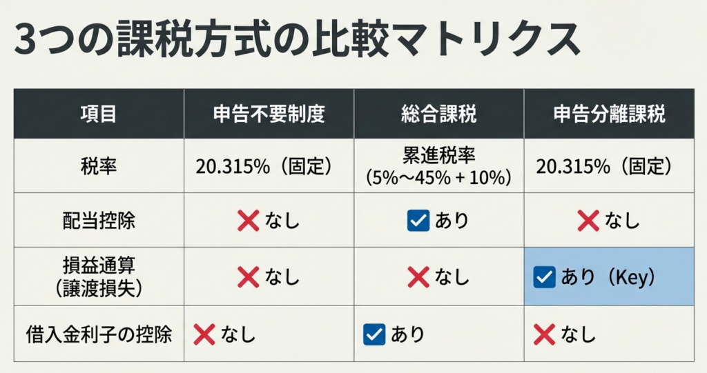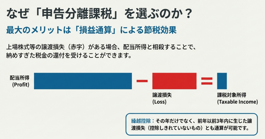 本制度を選択する主な利点は、上場株式等の譲渡損失との損益通算ができることです。一方で、総合課税で適用される「配当控除」は受けられなくなります。