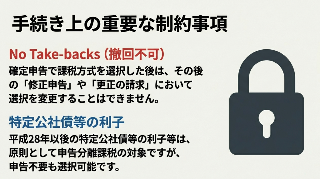 ここが最も重要な「実務の要」です。 確定申告において、一度「申告分離課税」や「総合課税」、「申告不要」のいずれかを選択して申告書を提出すると、後から「やっぱり別の方式の方が有利だった」と気づいても、修正申告や更正の請求で変更することは一切できません。