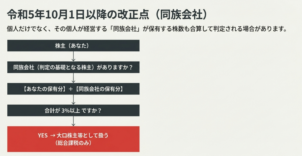 株主本人だけでなく、その株主を判定の基礎として選定した場合に同族会社に該当する法人の保有分も合算されます。この株式等保有割合が3パーセント以上となる場合、その株主が支払を受ける配当等は、大口株主等と同様に総合課税の対象となります。