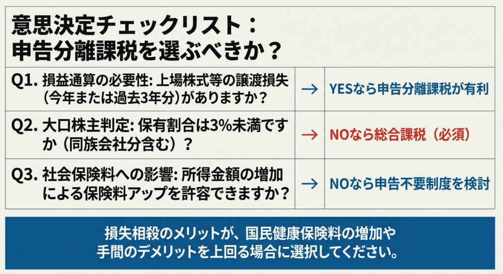 一度確定申告でこの方式を選択すると、後から修正申告等で変更することはできません。また、申告分離課税を選択した配当所得は、扶養控除等の判定における「合計所得金額」に含まれる点に留意が必要です。