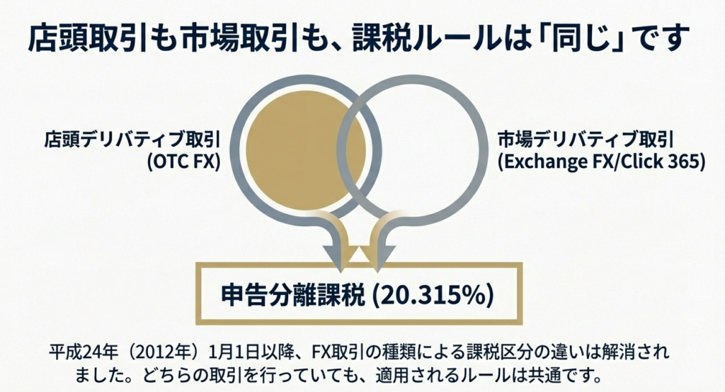 現在のFX課税は、平成24年以降、取引形態(店頭か市場か)を問わず統一されたルールが適用されており、非常に整理された体系となっています。