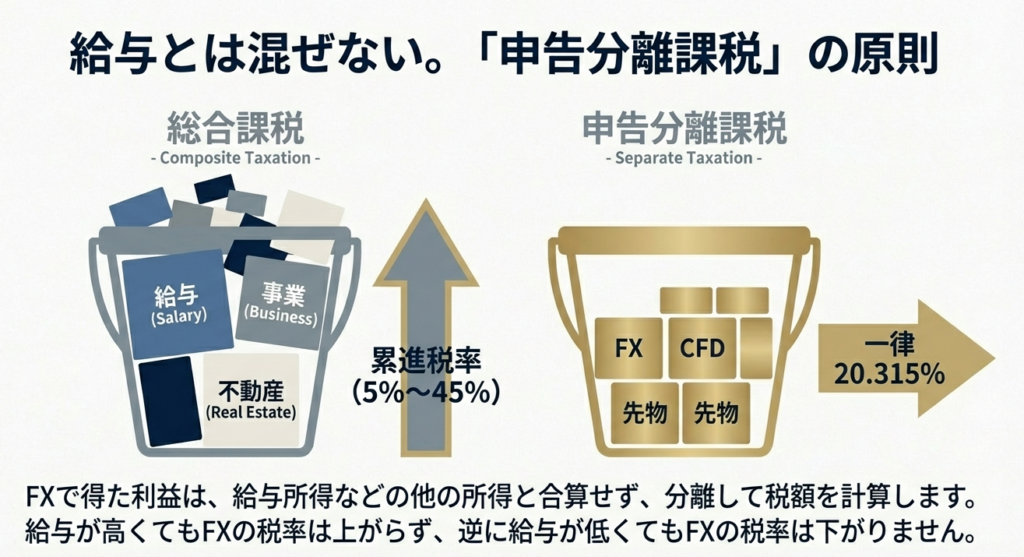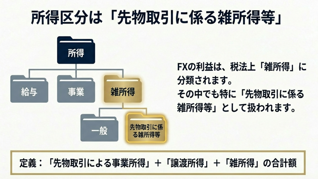 FXの利益は「先物取引に係る雑所得等」に分類され、他の所得(給与や不動産所得など)とは合算せずに税額を計算する「申告分離課税」の対象となります。