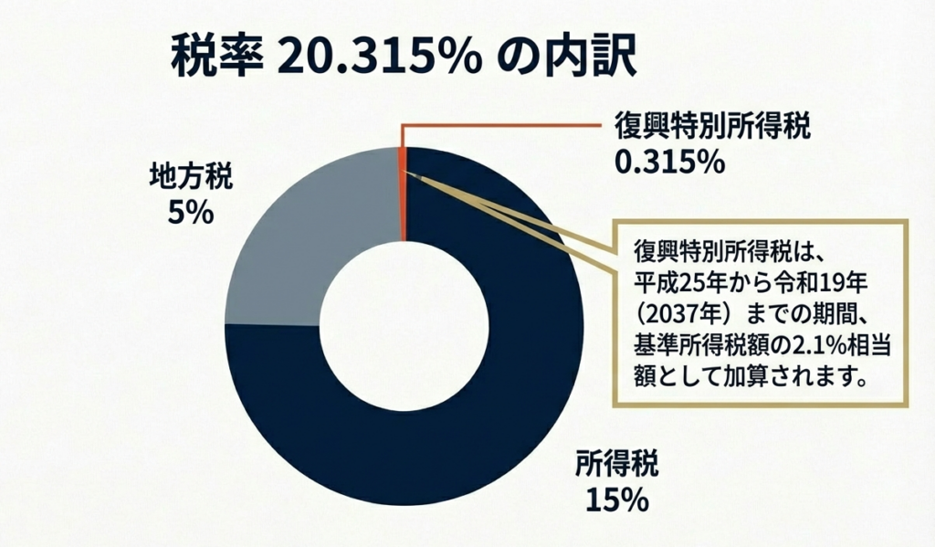 所得税が15パーセント、地方税が5パーセントの合計20パーセントの税率が適用されます。ただし、これとは別に復興特別所得税が加算されます。