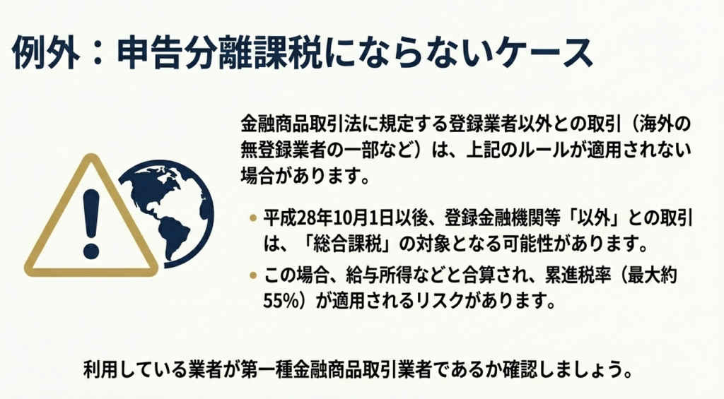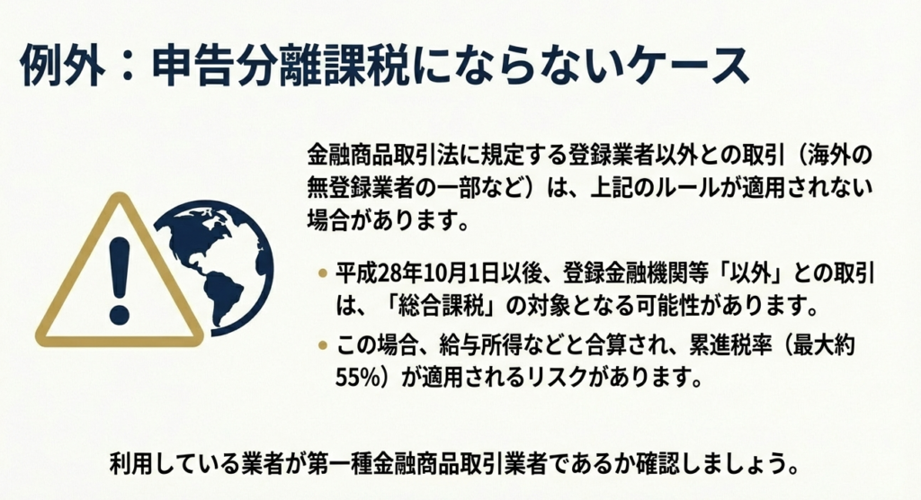 金融商品取引法上の登録を受けていない業者や、特定の登録機関以外との店頭取引は申告分離課税の対象外です。