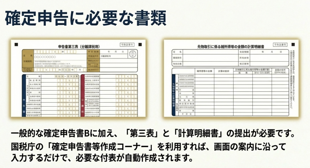 「確定申告書等作成コーナー」を利用すれば、画面案内に従って入力することで自動的に付表や明細書が作成されます。また、「先物取引に係る雑所得等の金額の計算明細書」も用意されています。