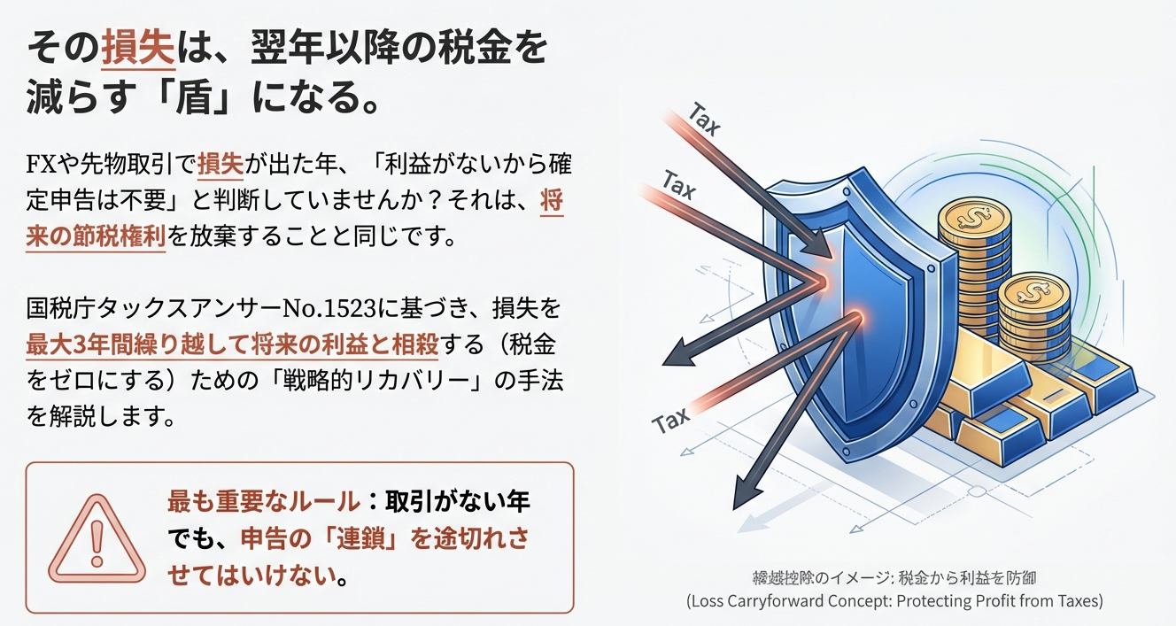 損益通算を行ってもなお控除しきれない損失がある場合、翌年以降3年間にわたって、その損失を「先物取引に係る雑所得等」の金額から差し引くことができます。これには「損失が出た年」および「その後継続して」確定申告を行うことが要件となります。