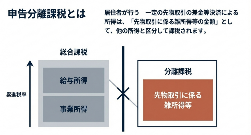 先物取引に係る雑所得等の課税は、給与所得など他の所得と合算して累進税率を適用する「総合課税」ではなく、他の所得と切り離して計算する「申告分離課税」が適用されます。