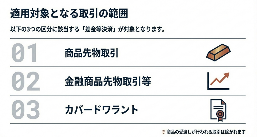 本制度の対象は、一定の先物取引等について「差金等決済」を行った場合に限られます。実務上、以下の3つのカテゴリーを正確に区別することが重要です。
