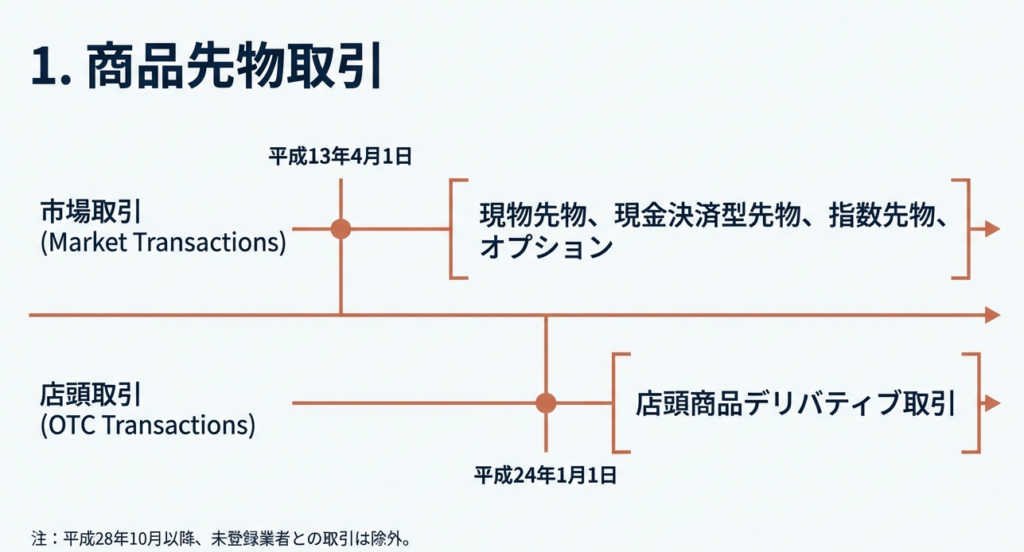 ・商品先物取引法に基づき、商品市場で行われる取引(現物先物、現金決済型先物、指数先物、オプション取引)。