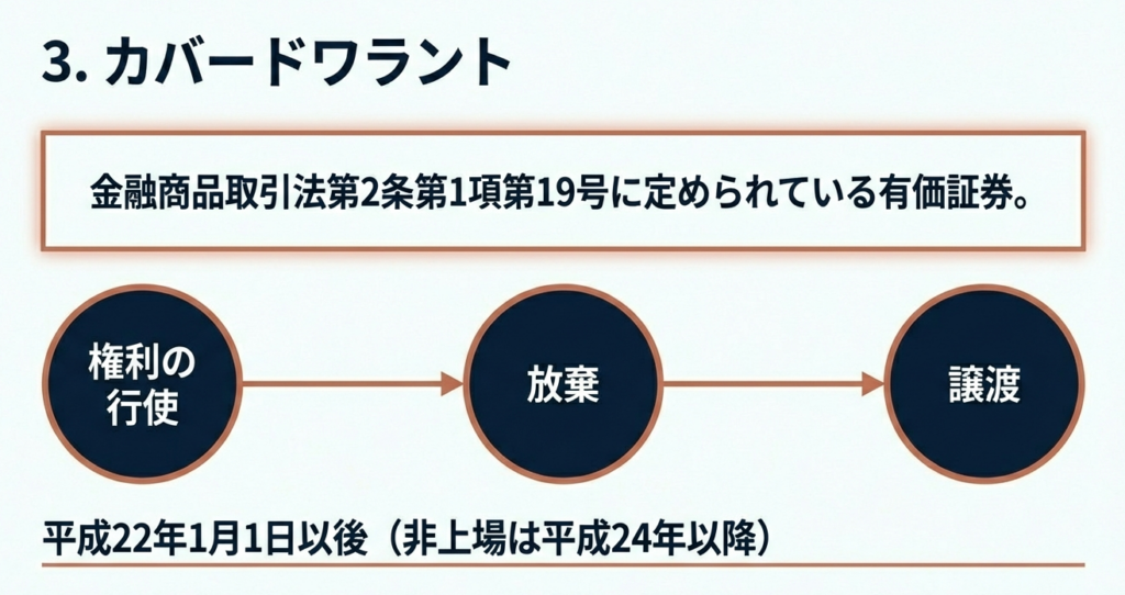 ・金融商品取引法に規定する証券(カバードワラント)の権利行使、放棄、または譲渡による差金決済。