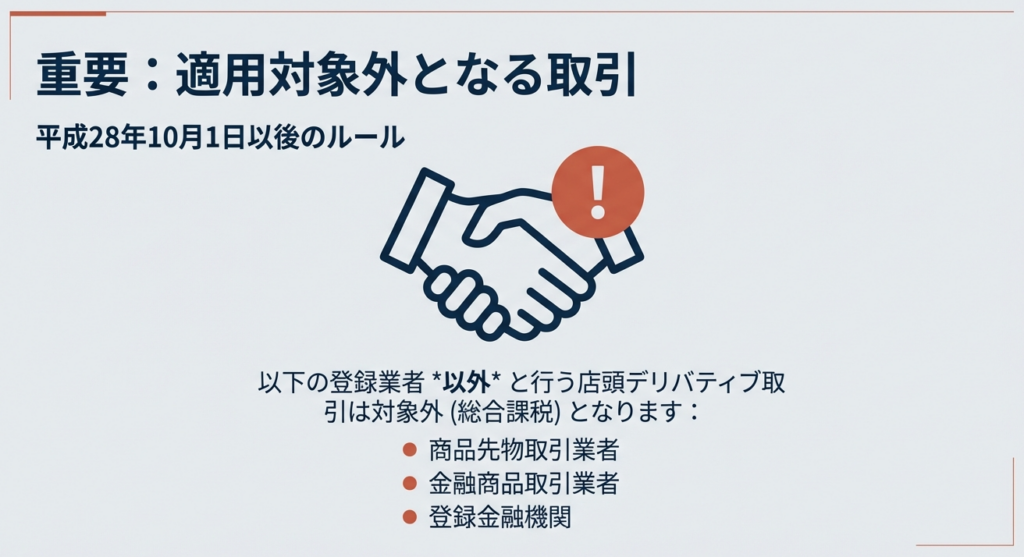 店頭取引の場合、相手方が「第一種金融商品取引業を行う者」または「登録金融機関」以外である場合は対象外となります。海外業者を利用しているケースなどは、この要件を満たしているか慎重な確認が必要です。