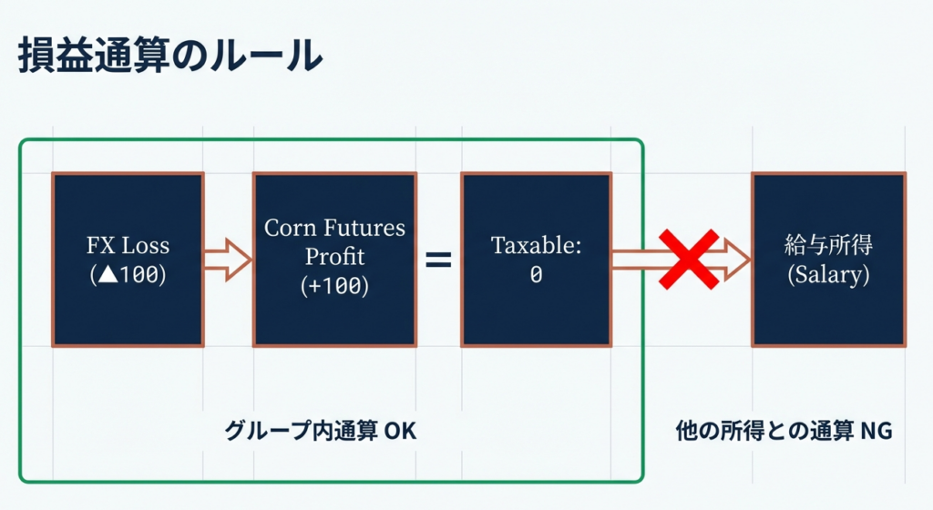 この区分で生じた損失は、他の「先物取引に係る雑所得等」の利益とのみ相殺(損益通算)が可能です。給与所得や、上場株式等の譲渡損益など、他の区分の所得とは通算できません。