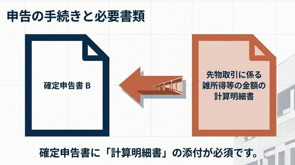 確定申告書に「先物取引に係る雑所得等の金額の計算明細書」を添付する必要があります。所轄の税務署へ提出することで手続きを行います。