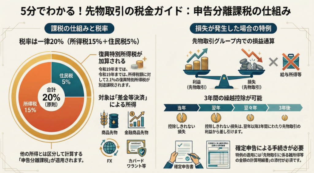 一定の先物取引(商品先物、金融商品先物、カバードワラント等)の差金決済で生じた所得は、給与所得など他の所得と区分して「申告分離課税」となります。税率は20.315%(所得税15%+復興特別所得税0.315%+地方税5%)です。