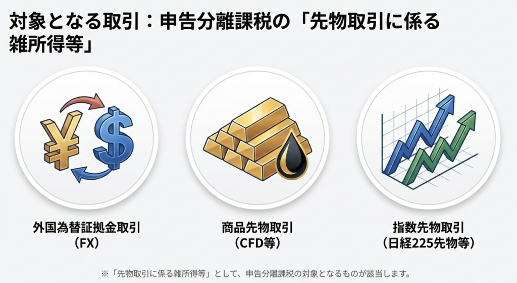 FXでの損失と、日経225先物や商品先物での利益は、同じ「先物取引に係る雑所得等」の区分内であれば、その年の中で相殺が可能です。