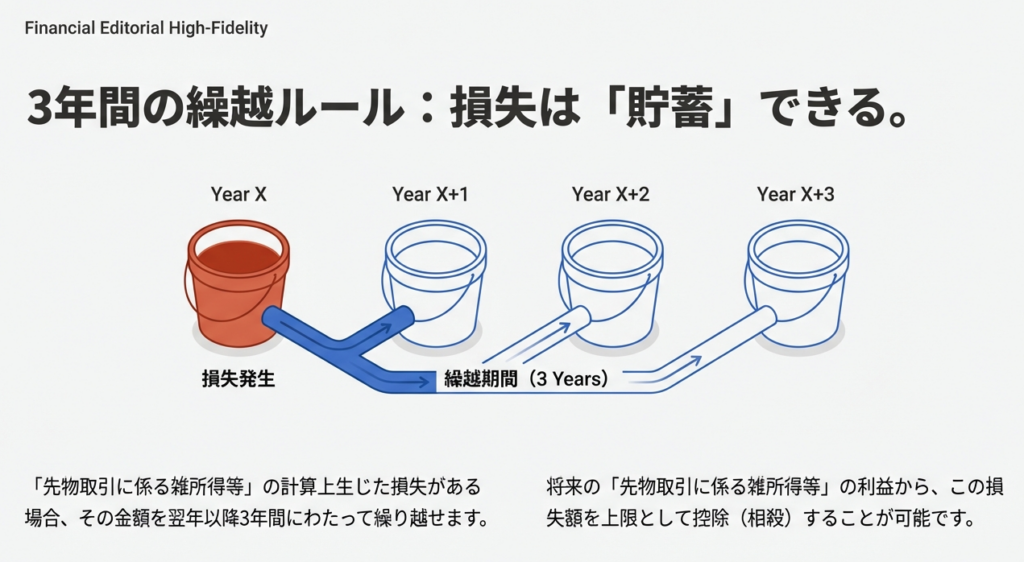 この制度の核心は、「先物取引に係る雑所得等」で生じた損失を、翌年以後3年間にわたって繰り越し、将来発生する同所得から控除できるという点にあります。