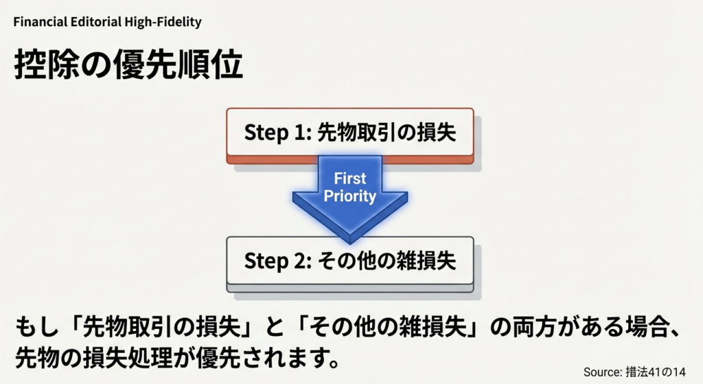 まず先物取引の差金等決済に係る損失の繰越控除を先に行い、その後に雑損失の繰越控除を行う必要があります。この順序は法令によって定められています。