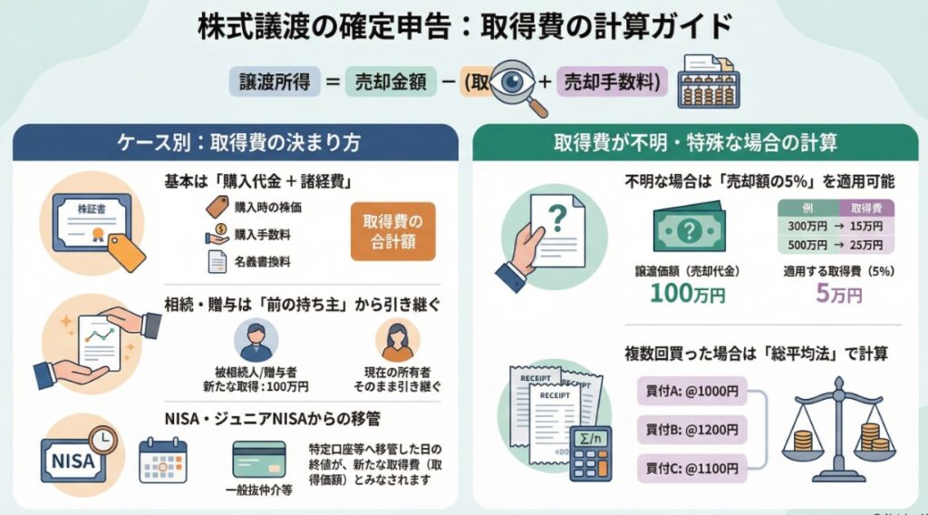 相続や贈与で取得した株式は、原則として前の持ち主の取得費を引き継ぎます。一方、NISA口座等から特定口座や一般口座へ移管された場合は、移管日の終値が取得費とみなされます。