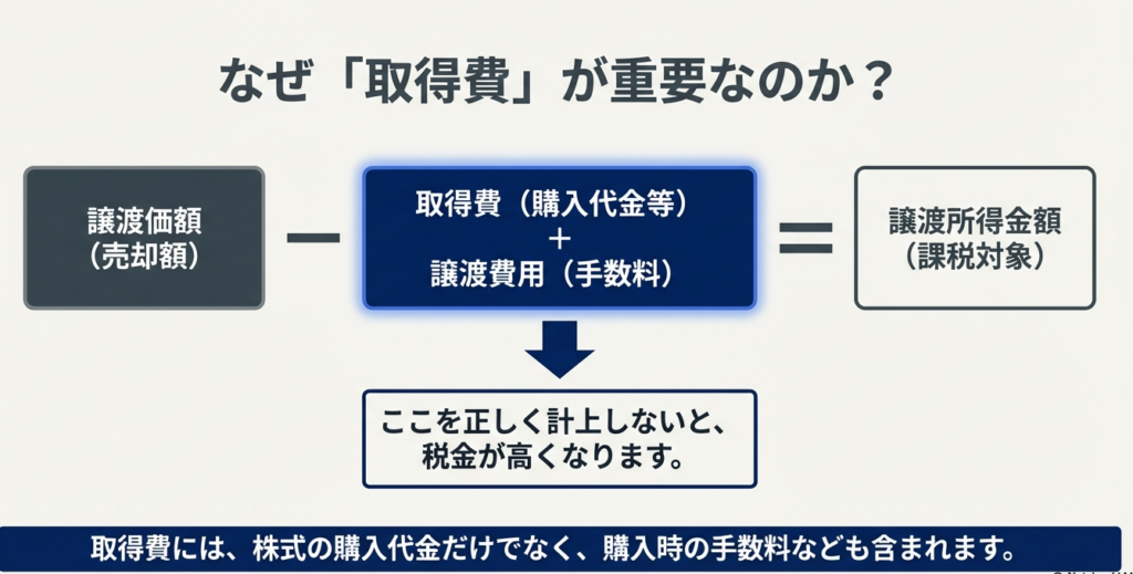 取得費には、単なる「株式の購入代金」だけでなく、購入時の手数料(消費税を含む)や名義書換料など、その株式を取得するために直接要した費用がすべて含まれます。ここが落とし穴なのですが、これらの付随費用を漏らすことは、本来払う必要のない税金をクライアントに負担させてしまうことと同義です。