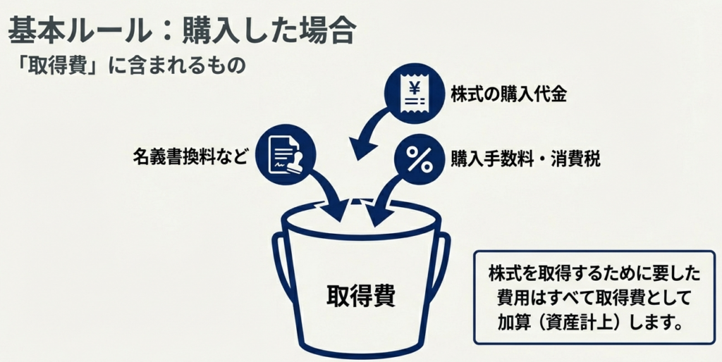 取得時の払込代金や購入代金に加え、購入手数料(消費税を含む)が含まれます。また、その株式等を取得するために直接要した名義書換料などの費用も取得費に含めることが可能です。