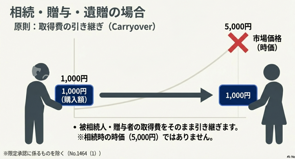 相続開始日または贈与の日における終値に相当する金額で取得したものとみなされます。通常の相続とは異なり、引き継ぎではなく、その時点の時価が新たな取得費の基準となります。