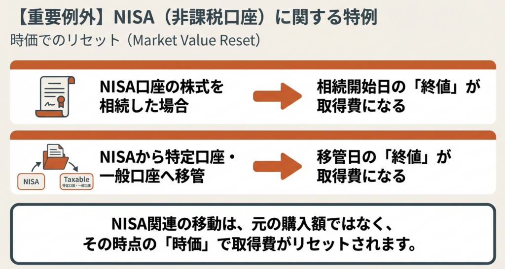 非課税口座内の株式が相続等により払い出された場合は、例外的に「相続開始日(または贈与の日)の終値」を取得価額とみなします。