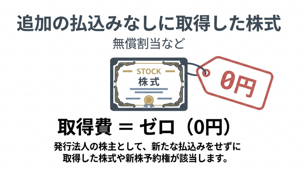 発行法人の株主等として、新たな払込みや給付を要しないで取得した株式または新株予約権の取得費は「零(0円)」となります。追加のコストを支払わずに取得したため、取得費は発生しません。