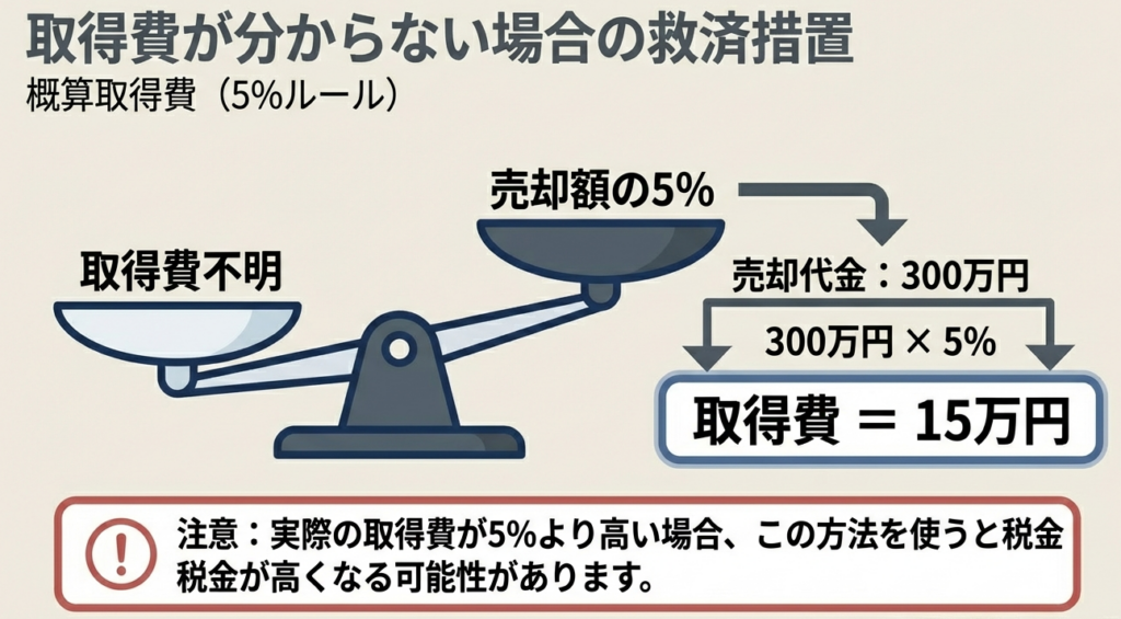 同一銘柄ごとに、売却代金の5パーセント相当額を取得費とすることが認められます。例えば300万円で譲渡した場合、取得費が不明であれば15万円を取得費として計算できます。