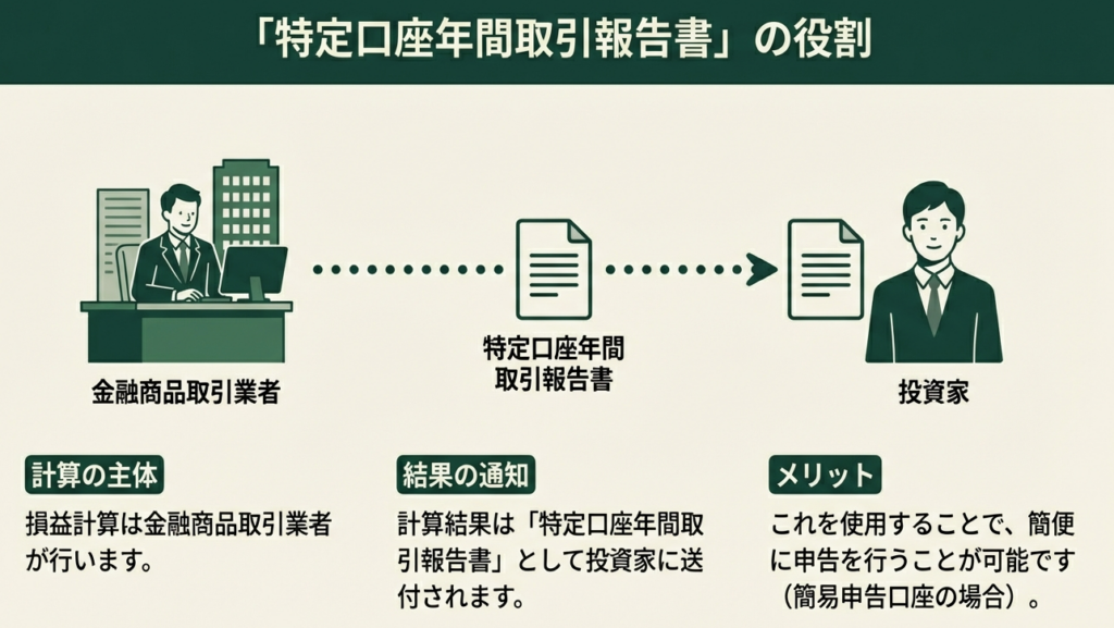 譲渡損益の計算は金融商品取引業者等が行います。その結果は「特定口座年間取引報告書」としてまとめられ、納税者に送付されます。
