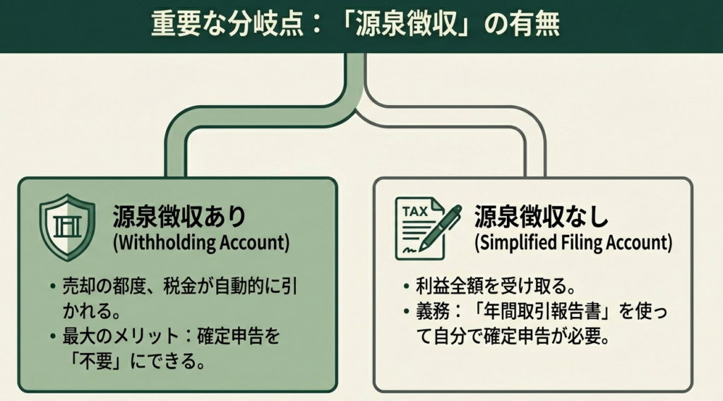 | 項目 | 簡易申告口座(源泉徴収なし) | 源泉徴収口座(源泉徴収あり) |