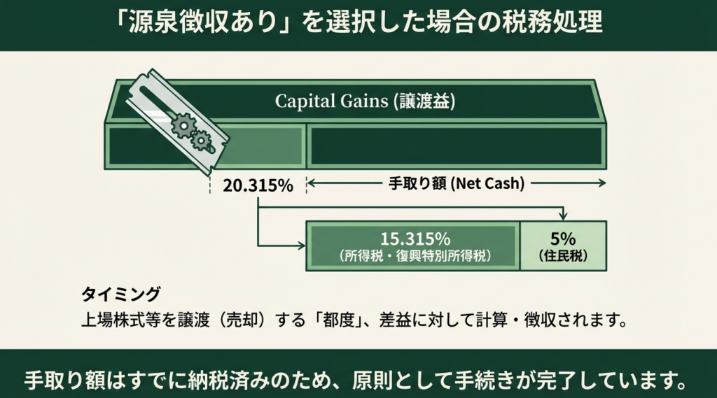 | 納税のタイミング | 確定申告時に納付 | 譲渡の都度、源泉徴収(還付) |