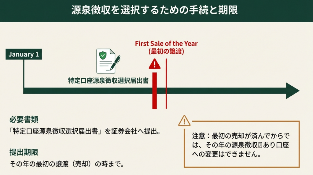 - 源泉徴収の選択は「その年の最初の譲渡まで」が絶対の期限です。 年の途中での変更は不可能です。