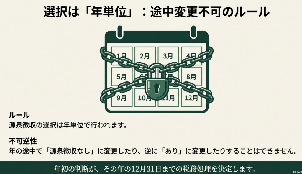 変更することはできません。源泉徴収の選択は年単位で行われるものと定められているため、年の途中での変更は認められません。