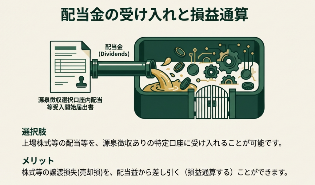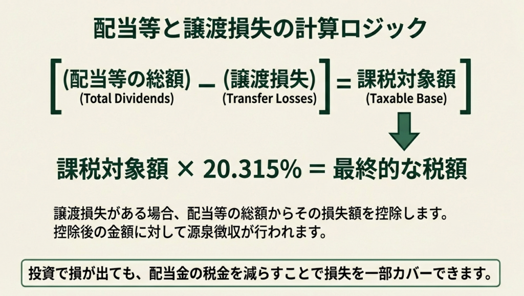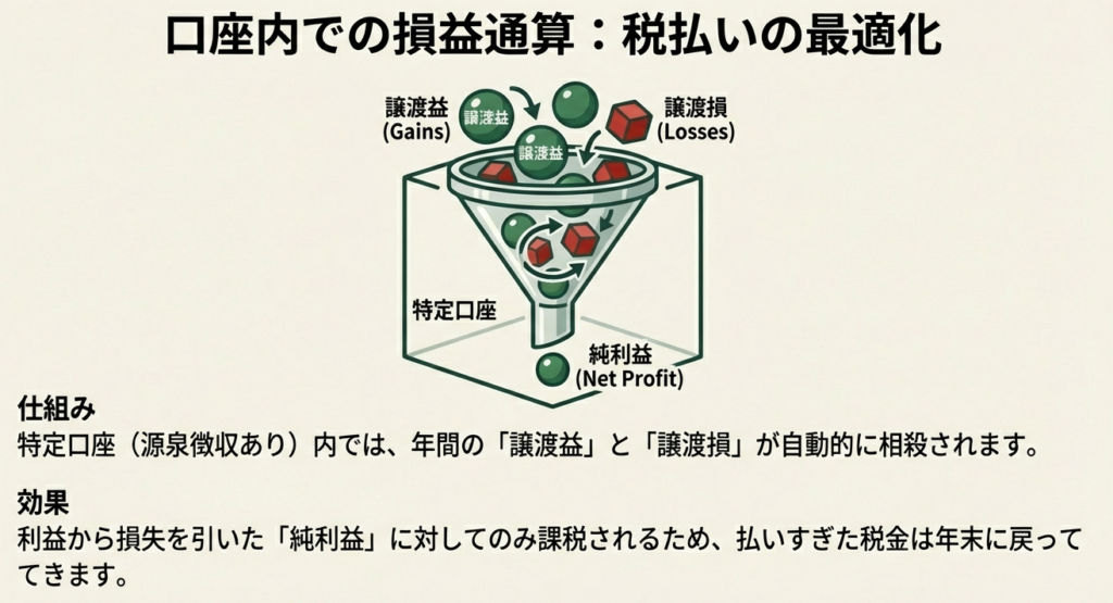 源泉徴収口座の戦略的価値をさらに高めるのが、譲渡損失と「利子等および配当等」を口座内で自動的に相殺できる仕組みです。