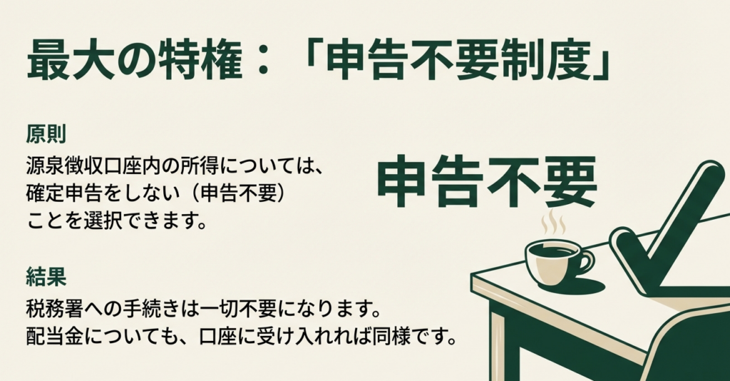 源泉徴収口座内の所得については、原則として確定申告を不要とすることができます。ただし、納税者の選択により、口座ごとに申告するか申告不要とするかを選ぶことも可能です。